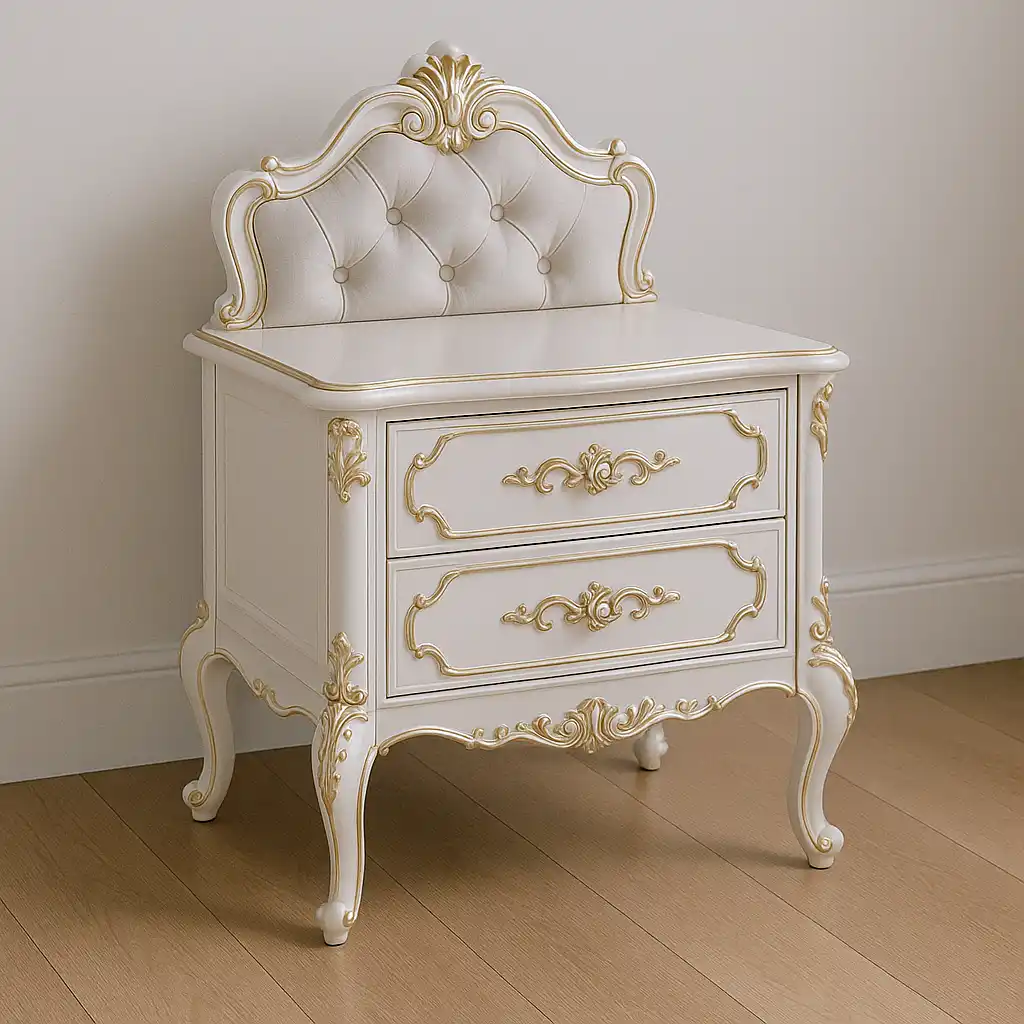 Avangart komodinlerde altın varak uygulaması tek başına kullanılmaz; genellikle oymalı detaylar, bombeli yüzeyler ve gösterişli kulplarla desteklenir.