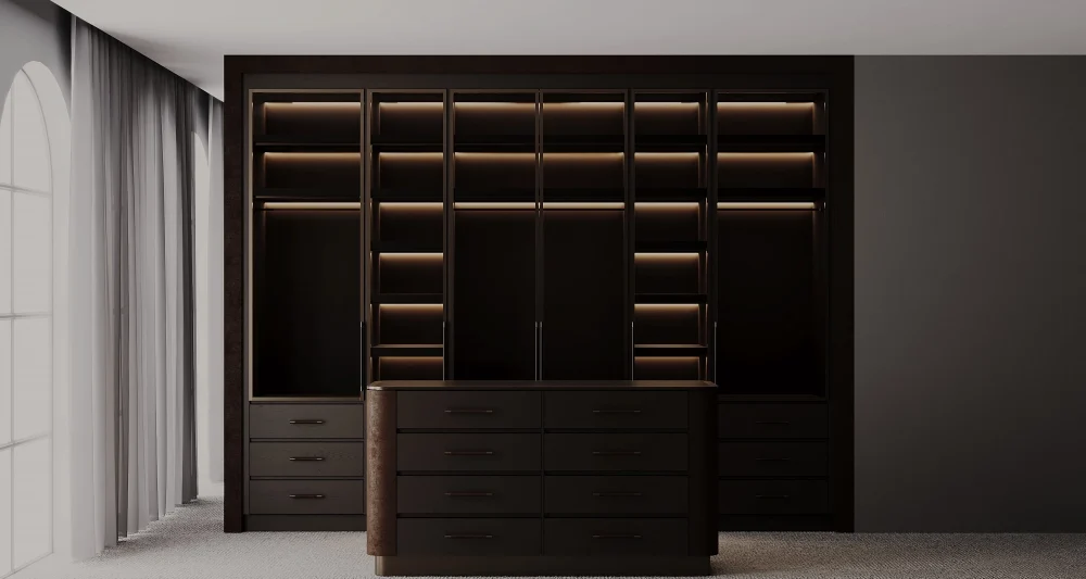 Giyinme odanız, gerçek anlamda rahatlayabileceğiniz yerdir. Furniture Schaumann olarak, aksesuarlarınızı ve mücevherlerinizi şık bir şekilde sergilemenin önemini anlıyoruz. Uzmanlarımız, değerli eşyalarınızı sanatsal bir şekilde sergilemeniz için akıllı çözümler sunacak. Değerli mücevherleriniz için ışıklı vitrinlerden, aksesuarlarınızı ortaya çıkarmak için kolayca açılan akıllı çekmecelere kadar, birlikte hazinelerinizi parlatacağız.