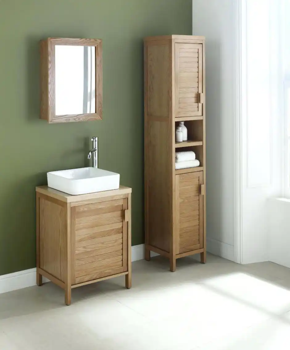 Hayalinizdeki banyo için ilk dolapla başlayalım. Duvara monte edilebilmesi sayesinde, destek için çerçeve veya ayaklara ihtiyaç duymaz. Bu, temizlik rutininizi kolaylaştıracak ve doğrudan ışığın (hem yapay hem de doğal) geçmesine izin verdiği için banyonuza daha ferah bir görünüm kazandıracaktır. Showroomumuzda doğal ahşap kaplamalı olarak da mevcut, ancak bu sefer size 2024’te iç tasarımda trend bir renk olan adaçayı yeşilini sunuyoruz.Banyo Mobilyası