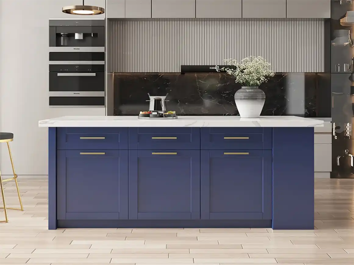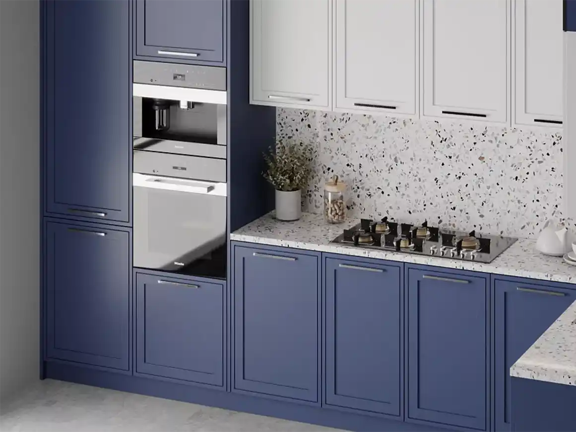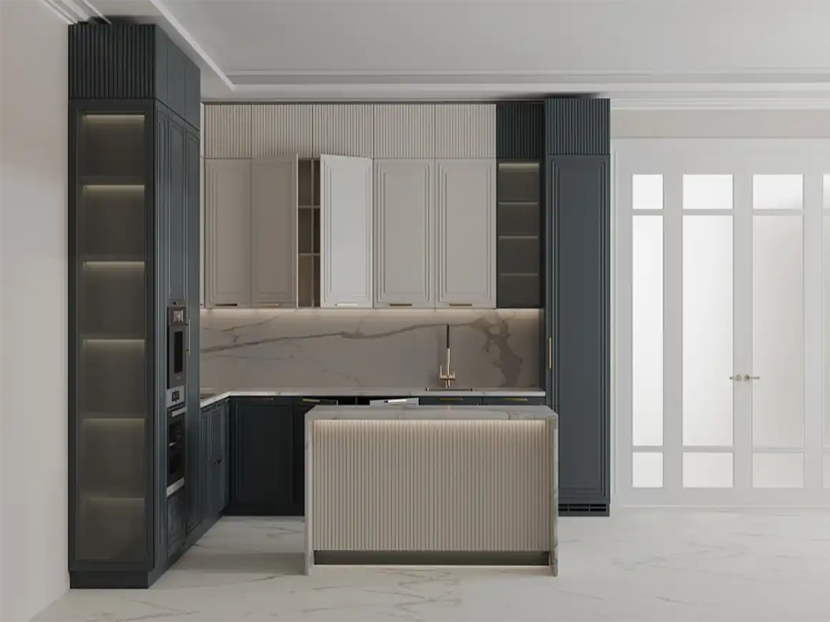 Modern ve cesur, şık bir ambiyans için lacivert ve krem beyazı gibi iki tonlu paletleri, mat dokuları ve minimalist kulpları bir araya getiriyor.