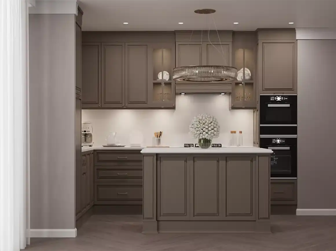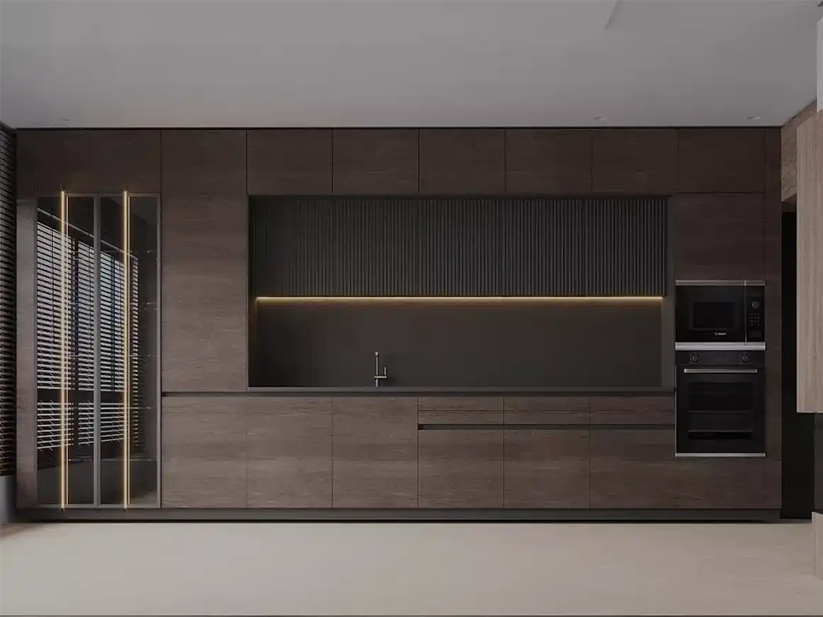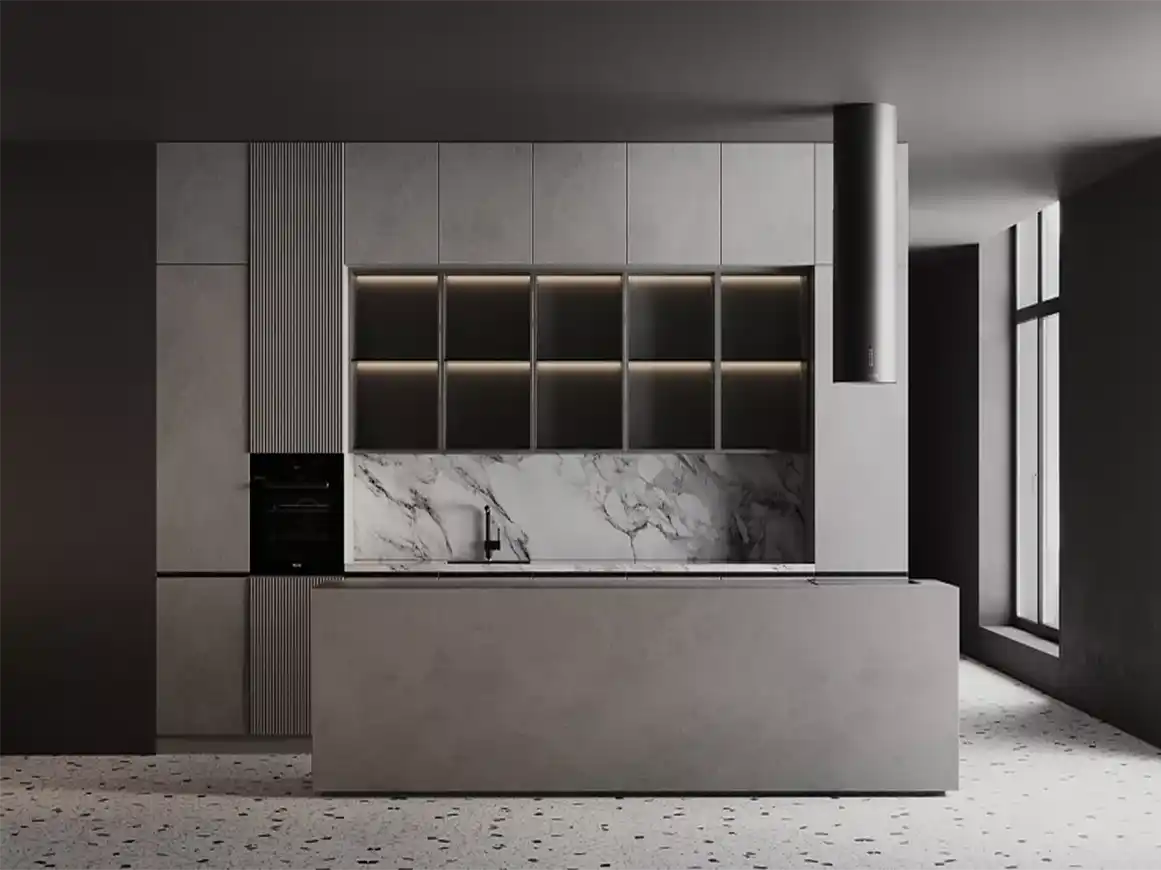 Temiz ve çok yönlü, sade bir sofistike görünüm için çerçevesiz tasarımlar ve basit gömme kulplarla mat yüzeylerde nötr toprak tonlarını kullanır.