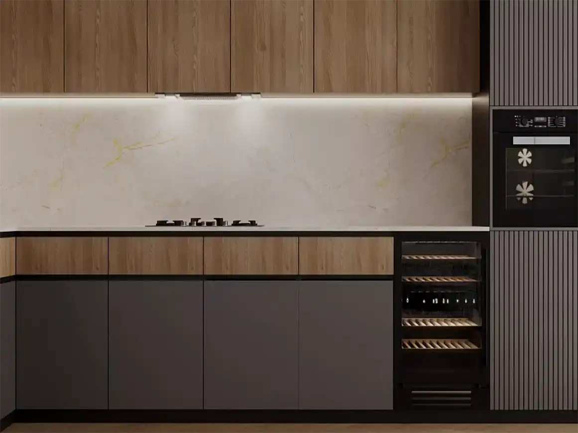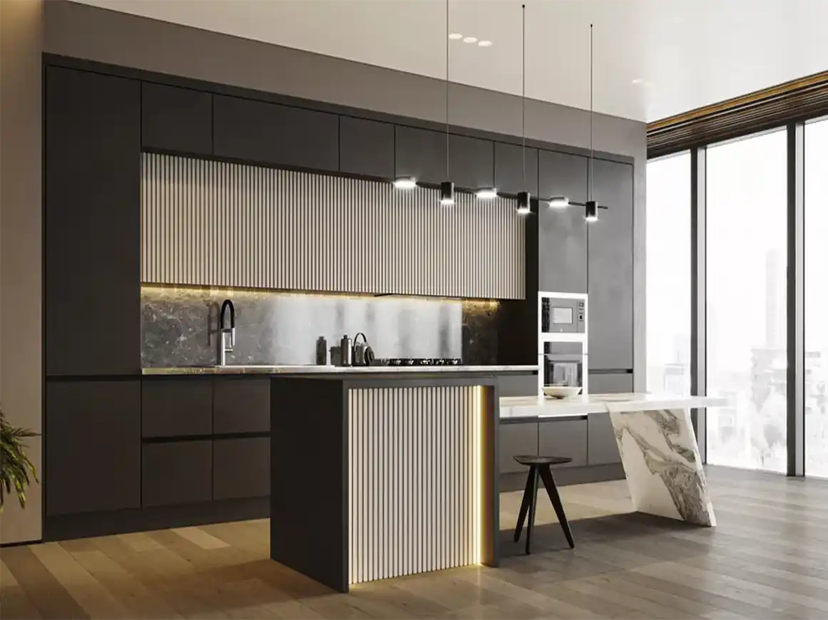 Çıtalı dolap kapaklı bir mutfakta birinci sınıf kaplama